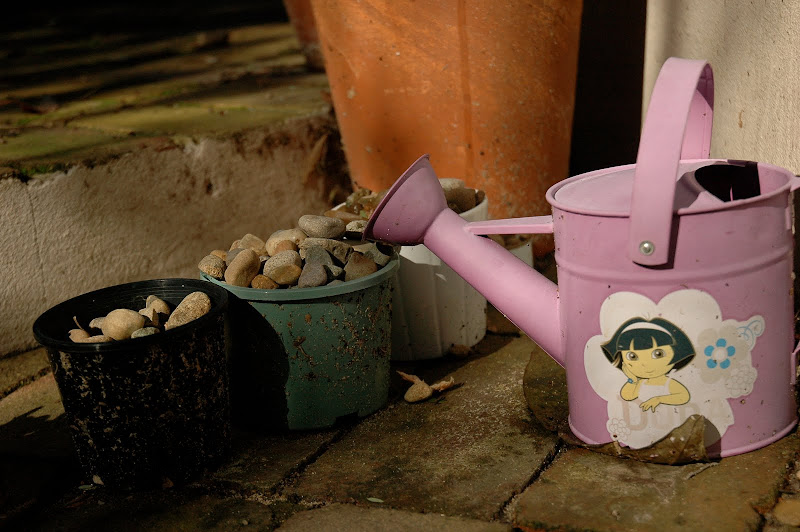 Its been the wettest July in 10 years (or something like that), but finally the sun is out. This is a good thing - we don't have to put on gumboots to go to the park, I can get some washing dry, and my succulents finally have a chance to dry out and bask in the sunlight. Tab and I did a bit of pottering today and she came up with some very creative pot plant ideas. I actually think the sticks look very cool - don't know about the 'rock plants' though. Tab keeps checking to see if anything has shot up but not even Dora is going to make them grow.